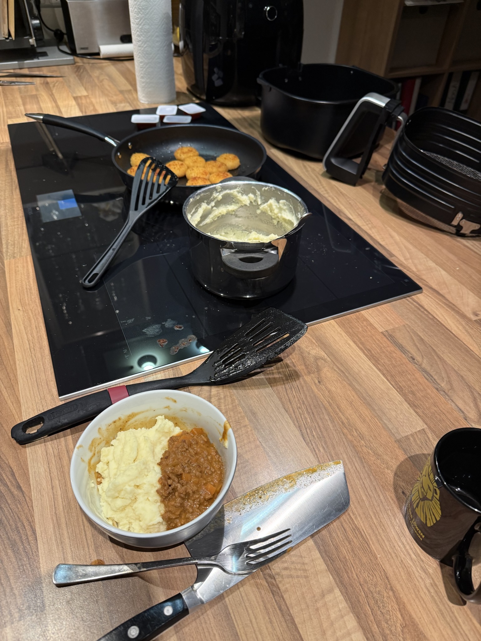 Ich aber hatte an diesem Samstag-Abend noch einen Termin – und Kinder und Jugendliche machten sich einfach selbst Dino-Nuggets im Airfryer zu Abend. Denn der Papa war auch unterwegs.