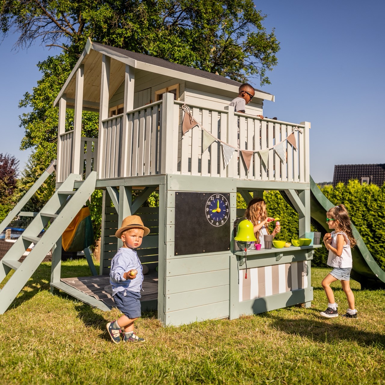 Das Baumhaus-System lässt sich ganz individuell an Grundstücksgröße, Architektur und Spielbedürfnisse anpassen – und benötigt dazu keinen alten, knorrigen Baum im Garten!